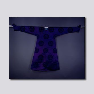 现藏首都博物馆。形制为圆领右衽,马蹄袖,四开裾。浅耦荷色缎地,割绒五蝠捧寿团花图案,团花直径为17厘米。