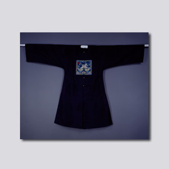 清身长124厘米,通袖长178厘米 现藏首都博物馆。形制为圆领对襟。青色直径纱地。前胸、后背缀方补。方补长29.3厘米,宽28.5厘米,纳纱绣云鹤日纹,鹤与红日采用贴绣方法绣于云上,鹤下纳纱绣山、水纹。