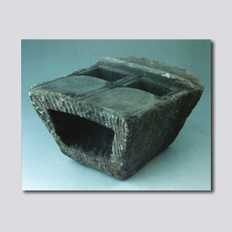 元长32厘米 宽28厘米 厚18厘米 青石。砚首雕曲线纹,尾收腰,有墨池二。池下凿空膛,膛内壁遗烟熏痕迹。膛表面因火烧呈白灰色,可知原空膛为加热设置。墨池中除遗留墨色遗迹外,还遗有红色痕迹。这种形制的砚不多见,为北方寒冷地区所特有。此砚出土于北京德胜门以东元代遗址。