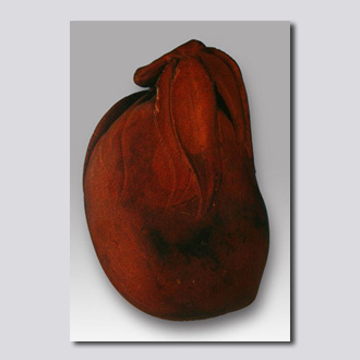 明长10.8厘米 宽6.9厘米 厚2.5厘米 澄泥砚为中国四大名砚之一,产于山西绛县,以汾河水中长年所贮沉泥,风干制砚,再烧炼而成。砚质坚硬,发墨细润,贮墨、贮水均耐久。 此砚是绛褐色,雕刻成桃形,两片桃叶间为砚池,砚底略平。做工精巧。