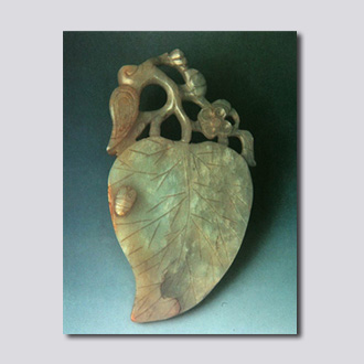 明长15厘米 宽7.8厘米 厚1.6厘米 玉砚的制作始于汉代,为观赏之用。汉《西京杂记》中载:“以玉为砚,亦取其不冰。”此砚青白玉雕成硕大花叶,叶面上栖一蝉,叶脉以阴刻线而成。砚底叶脉清晰,略平。配有紫檀木整挖盒。