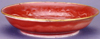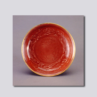 红釉瓷是元景德镇创烧的新品种之一。此盘壁印有首尾相逐的暗龙两条,盘心印流云纹三朵,是景德镇红釉暗花瓷器的佳作。
