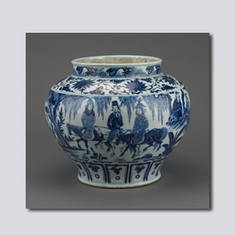 元青花瓷器经常绘画元曲图案,罐腹绘历史上被人传诵的"昭君出塞"的故事。