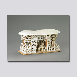 此瓷枕雕镂成戏台形式,戏台上珠帘漫卷,众多演员正在演出一场戏剧,反映了元代戏剧流行的社会风尚。瓷枕镂雕精细,集建筑、舞台与瓷塑艺术于一体,表现出元代戏剧艺术的面貌及景德镇窑工高超的制瓷工艺。