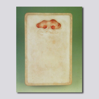 白端。长方形,石产于广东肇庆七星岩。色纯白,宜研朱。砚池巧作灵芝状,构思新奇,琢刻精细。池内残存朱砂墨渍。白中泛红,古雅可爱。