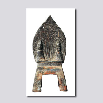释迦、多宝二佛并坐像来源于佛教《法华经·见宝塔品第十一》--多宝佛赞叹释迦牟尼佛演说《法华经》而分半座与释迦佛共同说法的故事。这两尊像形象特征基本一致,跏趺端坐,头饰螺发,顶现高肉髻,身着通肩袈裟,面相模糊,双目低垂,时代特征鲜明。像身下有四足座床,身后有尖圆形大背光。