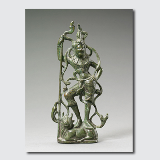 摩醯首罗天又称大自在天,原为印度婆罗门教天神,是佛教最早吸收的护法神之一。这尊像右腿弓,左腿立,双脚踩牛身。左手叉腰间,右手举于右侧握长杵;面形丰满,神态威猛。上身饰璎珞,下身着短裙,周身饰飘转的大帔帛。整体形象生动、威武,动感十足,体现了盛唐时期造像的鲜明特点。此类题材少见,有一定研究价值。