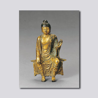 唐代佛像艺术到唐中期达到鼎盛,这尊像就是盛唐时代表作品。佛像善跏趺坐姿,左手举于身体左侧,右手置右膝上。头饰磨光高肉髻,面相圆润,神态庄肃。上身内着僧祗支,外披袈裟。衣纹写实自然,圆转流畅,尤其是下腹和腿部衣纹呈"U"字形分布,形象地表现了衣服轻薄柔软的质感。躯体雄健,肌肉饱满而富有弹性。整体做工精致,造型完美,气势恢宏,堪称盛唐造像典范之作。