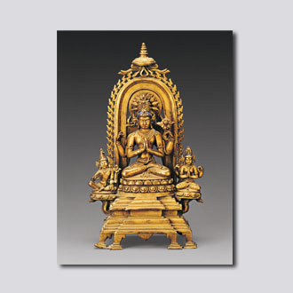 四臂观音菩萨为藏传佛教崇奉的重要神祗,有"雪域怙主"之称。这尊像跏趺端坐,头戴花冠,耳际冠结横出,宝缯翻卷。面颊丰满,深目圆睁。上身袒露,饰项圈、臂钏和手镯,左肩挂禅思带,下身着薄透长裙。中二手合掌,余二手举于身体两侧,右手持念珠,左手持莲花。主尊左右分别有跏趺坐四臂观音和游戏坐莲花手菩萨像。莲座下是多角向上收缩的叠涩式台座,身后有舟形火焰纹大背光,背光顶部饰圆形伞盖。整躯造型极其优美,体现了印度帕拉造像鲜明特点。
