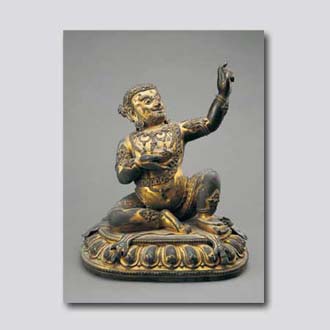 毗瓦巴是印度八十四位大成就者之一,藏传佛教萨迦派尊奉的重要上师。此像头戴花冠,面形丰圆,双目圆鼓,形象威猛。面颊及下颌有螺卷胡须,两耳垂大圆环,一副印度人面孔。上身戴项圈,胸前饰璎珞,下身围兽皮,手腕、臂和足部有钏镯装饰。游戏坐姿,身体运转自然,躯体、四肢粗壮有力。右手当胸捧骷髅碗,左手高举,食指指天,表现毗瓦巴曾与卖酒女打赌时以手定住太阳的故事情景。底座上顺刻"大明永乐年施"铭文。整躯体量高大,艺术水平极高,是明朝宫廷造像中罕见的佳作。