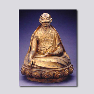四世班禅(公元1567-1662年),法名洛桑却吉坚赞,是西藏政教史上最有影响的高僧之一。此像跏趺坐于仰莲座上,头无冠,后脑勺奇大,额部鼓起一个小包;双目睁视,鼻梁挺直,双唇抿起,下颌尖凸,颧骨高隆;内着僧坎、僧裙,外披袒右肩袈裟和僧氅,衣纹流畅有力;右手置右腿上结触地印,左手置脐下结禅定印,整体形象奇特而写实,生动表现了四世班禅不同凡俗的形象特征,是一尊艺术水平极高的人物肖像。仰莲座上满刻藏文铭文,内容是说此像的内膛奉有四世班禅的生身舍利,功德无比殊胜。