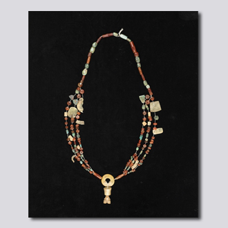 串项饰以玛瑙为主,形状大小不一,计110件;其次是绿松石饰件,计48件;再次为玉饰件,形状除管珠外,主要为形象的牛头、人面、璧形、兽面、兔形、鱼形、蚕形、扁平形、长条刀形、扁圆形等,计21件。