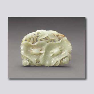 佩为青玉质,温润细腻。一块玉料对剖制成。以浮雕、透雕技法琢出荷叶、茨菰及水草纹,单阴刻线示叶脉,纹理清晰。荷叶中心各凸琢一只伸头相向爬行小龟,以双阴刻线琢出六角形甲纹。背面仅以粗犷的刀工琢刻出枝梗。古代将这种纹饰称为"龟游",寓祥瑞之意。这对玉佩构思严谨,造型生动,镂刻精细,抛光极好。据墓志知墓主为乌古论窝论,葬于金大定二十四年(1184),距今有八百余年。这是北京地区首次发掘的有明确纪年的女真族贵族墓,它是研究金朝历史和玉器发展史极难得的珍贵实物资料。