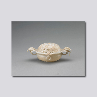 香薰为青玉质,青白色中夹有黑色小斑点,盖上镂雕蕃莲花纹,器身外满饰相互缠绕的蕃莲花,细圈形平底足内琢刻一朵盛开的蕃莲花,璧薄精巧,造型新奇,琢制纹饰细密剔透,呈玻璃光,是乾隆时期仿制痕都斯坦玉器中的佳品。