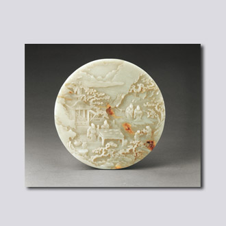 玉插屏是清代较为盛行的陈设品,琢制方法主要有阴线、浮雕,一般插于木座上。此件玉插屏屏心两面纹饰均采用多层浮雕技法琢刻,一面琢刻出长廊、芭蕉、桂树、桌、凳、人物;另一面琢刻出山水、垂柳、小船、人物,采用远山近景法,层次分明,技法精练,抛光极好。