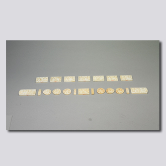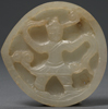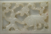 玉带板的制作始于唐代,五代、宋、辽、金、明时期都沿袭玉带制度。玉带由銙和铊尾(带头饰件称铊尾)组成,两者统称为带板。明早期是玉带板的鼎盛时期,晚期开始衰落,它是官场礼服必不可少的组成部分,不同的銙数和纹饰标志着佩戴者不同的身份地位。明代只有皇帝、皇后、妃嫔、太子、亲王、郡王、公、侯、驸马、伯及文武一品官才有资格使用。明初玉带板数量不一定。目前所见明永乐之后的玉带皆为20块,其中,銙18块,铊尾2块。明中叶以前玉带銙纹饰极为丰富,多用镂雕法。明中叶以后,则以素面居多。此套带板青玉质,色青白匀净无瑕。构思新颖,琢刻规整,光亮度好。全套20块,其中长方铊尾2块,桃形6块,小长方形4块,尺寸略有不同的长方形8块,都是深雕地子,有边框。其中10块浮雕人物戏狮图案,6块桃形的雕刻人物,4块小长方形的雕刻如意云纹。