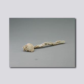 如意是中国传统的吉祥物,它由柄部和头部两部分组成,头部多作心形、芝形、云形,为赏玩之物。清代玉如意是最受人们喜爱的祥和玉,它不仅是贵族身边的宝物,也是贵族阶层相互馈赠的珍贵礼品。此件如意为青玉质,绿色闪黄,夹有绺纹,整雕过枝灵芝纹及宝瓶、蝙蝠,谐"福、寿、平安"吉祥之意,出土后仍有极好的光亮。