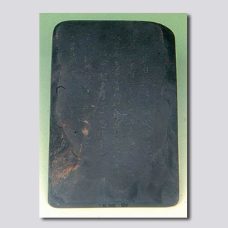 清长18.6厘米 宽12.7厘米 厚1.7厘米 此砚选用一块尚好的端石为料,内有“鱼脑冻”,天然成趣。作者着力于表现石质的美妙,不加雕饰,打磨平整四方,突出石色之美。砚一侧刻有铭文。