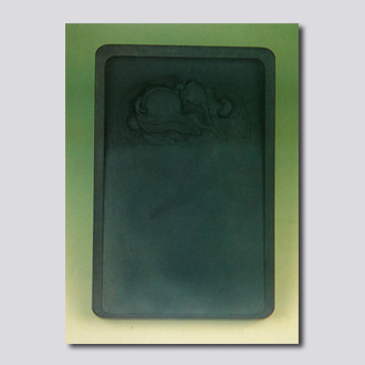 此砚作长方形。做工洗练,墨池处雕一只大桃和一对蝙蝠,取其“福寿”之意。