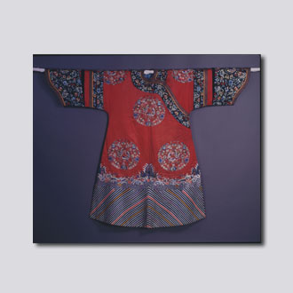 清光绪(1875-1908)身长141厘米,通袖长183厘米 现藏首都博物馆。形制为圆领右衽,左右开裾,直身袍。大红缎地,绣九团“喜相逢”团窠图案。团窠直径29.5厘米,以蝴蝶上下盘旋相戏为主景,周围点缀蝙蝠及各种花卉。袖边平金织“卍”字曲水纹。蝴蝶图案采用十九种颜色。刺绣针法有套针、戗针、缠针等。