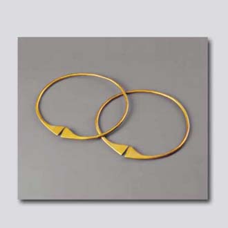 臂钏即臂环,古代称臂环为钏。《正字通·金部》上说“古男女同用,今惟女饰有之”,《南史·王玄象传》中也讲“女臂有玉钏”;由此可以看出,臂钏在早期是男女都佩带的饰物,以后才成为女性特有的一种装饰品。臂钏种类很多。此臂钏用直径0.4厘米的金条相对弯成环形,环两端锤扁呈扇形,整体光素无纹饰,造型简洁明快。与此同出的还有扁喇叭形金耳环、金笄等饰物,这批金器经测定含金量为百分之八十五,其它为少量的银和微量的铜。刘家河商墓从出土的铜器分析属于商代中期,该墓出土的金器地方色彩十分鲜明,极有可能是商朝周边少数民族制造的饰品;这些器物与北京、河北、辽宁等地夏家店下层文化墓葬中出土的金或铜质饰件形制相同,说明商代贵金属工艺的发生和发展与夏家店文化有密切的联系。这些器物形体完整,而且集中了发饰、耳饰、臂饰等系列饰物于一体,是研究中国早期金制品与装饰观念的珍贵实物。