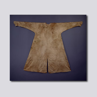 清初身长133厘米,通袖长188厘米北京北郊四道口清墓出土 现藏首都博物馆。形制为圆领右衽,前后开裾,马蹄袖,直身长袍式。驼色八枚缎地,上施行云二龙戏珠,边勾团花纹。龙袍斜襟处有银边扣四个。