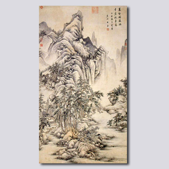 王翚(1632-1717),字石谷,号耕烟散人,又号乌目山人、清晖老人,江苏常熟人,王时敏、王鉴弟子,擅画山水,临摹宋元画作,集各家之长,技法精深,自成一格,为清初"四王"之一,虞山派首领。因画《康熙南巡图》,康熙皇帝赐书"山水清晖"四字。此图作于康熙元年(1662),是其早期精品。图中山石树木用笔苍秀劲健,用浅绛设色表现秋高气爽的景色。右上自题:"万壑树声满,千崖秋气高。壬寅腊月既望,虞山王翚"。下有"王翚之印"白文印。画幅上端有"嘉庆御览之宝"等清宫鉴藏著录玺印。