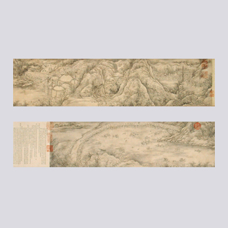 清代 纵21.1厘米,横194厘米 励宗万(1705-1759),字滋大,号衣园,又号竹溪,河北静海人,清代宫廷画家。擅画山水、花鸟,笔意恬雅,设色古淡。乾隆十年(1745),秋狩热河,木兰行围,乾隆皇帝命群臣作《秋郊大猎赋》,励宗万作赋并绘此图,以工笔白描绘围猎情景。图后有励宗万《秋郊大猎赋》,序中记:"乙丑八月圣驾遵岁巡之典,行秋狩之礼……命从臣咸赋秋郊大猎……"。