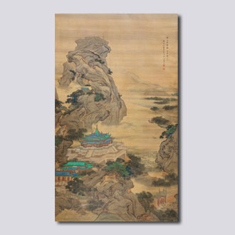 清代绢本设色纵224厘米 横134厘米 袁江(?-1746),字文涛,江苏扬州人。擅长界画山水、花鸟,笔法工整精致,描绘建筑结构严谨,设色明丽,风格富丽堂皇,是清代著名界画大师。此图作于康熙四十一年(1702),构图规模宏大,内容丰富,是袁江的代表作。图以唐朝九成宫(九成宫在陕西麟游县,原为隋代仁寿宫,唐太宗时重修作避暑之地,因山有九重故名)为题材,充分发挥了我国工笔山水画工整严谨、色彩鲜明、华贵典雅的特点。图中全景布局工整匀称,楼阁建筑及人物皆工笔重彩。