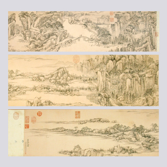 清代 纵26.7厘米,横245厘米 董邦达(1699-1769),字孚存,一字非闻,号东山,浙江富阳人,清代宫廷画家,属"娄东派"。擅画山水。代表作《烟磴寒林图》。此图为水墨长卷,气势宏大,勾勒群峰繁复万重,千山万水尽收眼底,笔法浑厚苍雄。画上有"乾隆御览之宝"、"石渠宝笈"等清宫鉴藏著录印。