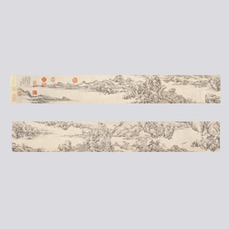清代 纸本水墨纵20厘米 横276.2厘米 陈书(1660-1736),女,字南楼,号上元弟子,浙江嘉兴人。擅画山水、人物,尤擅花鸟草虫,笔力遒劲,风神简古,意趣天然。她的作品,清宫内府收藏很多。其子钱界、从子钱子元、从孙钱载、族孙钱维城皆从其学画。此图绘辽阔山河,景象宏伟。卷尾自题:"由澉湖入万黄山,登山楼夜雨初晴,仿曹云西笔意。复庵陈书写,时年七十又七",及"女史陈书"白文、"南楼"朱文印。卷上有清宫"乾隆御览之宝"、"石渠宝笈"、"三希堂精鉴玺"、"宜子孙"等清宫鉴藏著录印章。