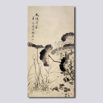 清代 纵189厘米 横94.5厘米。 张赐宁(1743-?),字坤一,号桂岩,沧州(今河北沧县)人。所绘山水气魄沉雄,用笔爽健,不拘旧法,气韵过人。兼擅墨竹、人物,尤以着色花卉独称绝技。此幅《太液清芬图轴》画泼墨荷花,荷叶用浓墨、淡墨挥洒而成,勾叶背筋脉,有的用赭石染叶背,荷梗以重墨挥写,配以勾花,丛芦疏萍,信笔点写,意态隽逸。