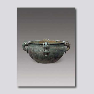 此鉴口沿处有四个形态各异的龙耳,一对为龙首衔环,一对为爬龙探首伏耳,生动活泼、妙趣横生。