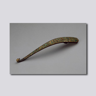 首都博物馆藏。钩作龙首状,器呈琵琶形,圆脐,鎏金,钩身以几何形图案镶嵌绿松石。此带钩尺寸大,实属少见,也是研究鎏嵌技术最好的例证。