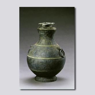 首都博物馆收藏。有盖,盖顶有莲瓣状捉手,口微侈,束颈,肩部两侧各置一铺首衔环,鼓腹,矮圈足。莲瓣状捉手中央饰以涡纹,口沿下以红铜镶嵌锯齿纹,由肩至下腹等距离镶嵌三周红铜。口沿部刻有铭文“陵阳”2字。此壶形制多见于战国中晚期。