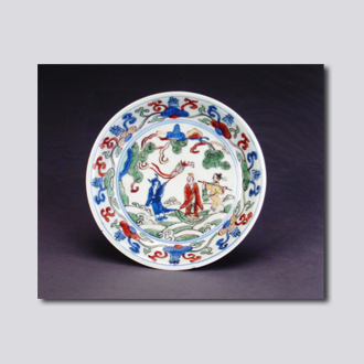 盘心主体纹饰描绘了仙人渡江的情景,周围绘松树,盘壁画灵芝、“寿”字,表现吉祥、长寿寓意。