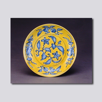 黄地青花是在白瓷胎上画好花纹后,施白釉高温烧造,再于白釉处填上低温黄釉,入炉低温烧成。此品种创烧于明宣德时期,流行于成化至嘉靖时期。