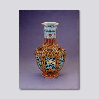 乾隆八年,督陶官唐英和其助手共同研制成夹层玲珑瓶九种,呈献给乾隆皇帝,套瓶就是其中的一种 。这件套瓶内为青花瓶,外为粉彩,腹部雕刻六组镂空花果纹。成型工艺非常繁复,需多次上釉多次入窑烧制而成,烧制成功极为不易。乾隆粉彩繁缛华丽,工艺精致。