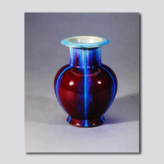 首都博物馆藏。石榴形。花口,束颈,鼓腹,圈足。通体施窑变釉,底刻“大清乾隆年制”6字3行篆书款。此尊以石榴造型,象征家族兴旺,多子多孙,吉祥幸福。火焰红的釉色和火焰青的釉色交融在一起,使器形与釉色有机地结合为一体,恰如一个成熟的石榴。