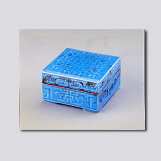 首都博物馆藏。方形,子母口,平底下呈四曲尺足,足脊窄薄。器内外满施蓝釉,器表印有虁龙纹,器底刻“大清乾隆年制” 6字3行篆书款。釉色光润匀净,色彩鲜明。刻工精湛。纹样简洁洗炼,排列有序。