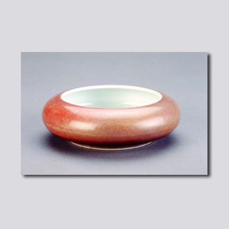 首都博物馆藏。圆形,敛口,圈足。内施白釉,外施豇豆红釉,足内施白釉,底书青花“大清康熙年制” 6字3行楷书款。此洗色调呈淡雅的桃红色,淡红釉中搀杂星点绿斑。釉层薄而细腻,古史曾有“绿如春水初生日,红似朝霞欲上时”的描述。豇豆红釉为康熙年间特有的品种。