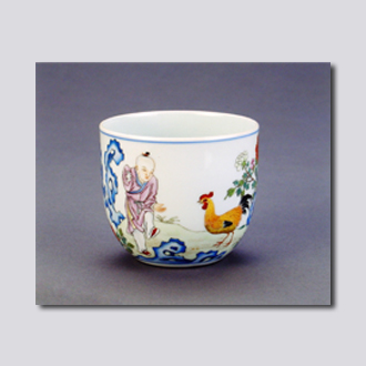 首都博物馆藏。敞口,深腹,卧足。外壁绘童子与鸡相嬉成趣的情景,旁绘山石、牡丹花,画面上小孩体态生动形象,雌鸡与四只小鸡觅食嬉戏,山石清秀。另一侧书乾隆御制诗,共132字。底书青花“大清乾隆仿古”6字3行篆书款。色彩艳丽,画面生动活泼,造型精巧。