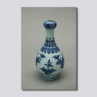 首都博物馆藏。蒜头口,细长颈,圆腹,圈足。口沿下绘一周回纹和缠枝莲纹。颈下部与肩部,绘变形莲瓣纹、回纹和如意云头纹。腹部主题纹饰为石榴、枇杷、牡丹、菊花等折枝花果纹。底书青花“大清乾隆年制”6字3行篆款。图案布局疏朗,错落有致,青花色泽靛蓝浓深,制作精细。因器口形制似蒜头,故有“蒜头瓶”之称。