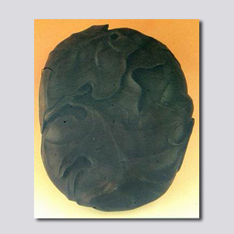 此砚石质细密滋润,且有天然花纹,蕉叶白、金银线。依石雕成瓜蝶状,中为淌池。砚背为片片硕大的瓜叶,寓意“子子孙,永绵绵”。