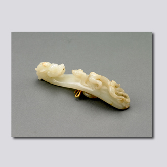 明清时期玉带钩的用途由实用的腰带扣,演变为装饰性的玩赏之物。造型趋于统一,以龙首玉带钩为主流。工艺上明代较粗宽,清代较细腻,光亮度高。特别是清代还出现了较多的翡翠龙钩。此件带钩青白玉质,带土沁,为"苍龙教子"图纹样,龙首为钩,钩背上浮雕一子螭,阴刻细毛发飘拂,圆钮上附一金别子。墓主万通是万贵的弟弟,万贵的长女为明宪宗宠妃,正因为这种戚族关系,万贵及其兄弟辈都封官加爵,显赫一时。