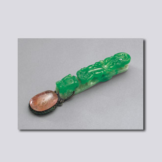 清代玉带钩质地优良,做工精细,造型及图案不拘一格。翡翠又称硬玉,清乾隆时期进贡内廷,是我国古代玉器制造业中的后起之秀。此物主人荣禄为清末大臣,深受慈禧太后信任,地位显赫,其墓葬位于朝阳区朝阳门外高碑店乡西花营村荣家茔地,墓中随葬大批金、银、玉器珍品。