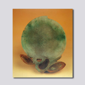 玉质。以翠玉琢雕成桃状,桃叶、桃柄展示自如。玉色灰白中夹有大片绿斑,似欲熟的碧桃。雕工不多,巧夺天工,且抛光极好,是观赏砚中的佳品。