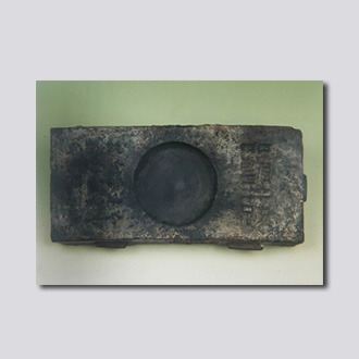 陶质。砚身采用六朝井迹砖所制。略呈拱形,两侧各有凸凹的榫(sǔn)头、榫眼。正面中间部位琢成圆形砚池,受墨处平坦,易发墨。由于年代久远,风化所致砚面粗糙,风格古拙。清代著名书法家、金石家黄易曾藏此砚,于砚池右铭文“六朝井迹”。左隶书“乾隆丙午冬钱塘黄易得于济宁州学”。