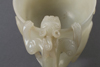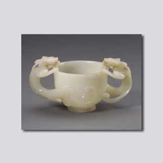 明代玉杯是当时的特色器物,此件玉杯是同期玉器中的代表作品,杯两侧镂雕螭虎,螭首额头上有阴刻"王"字,带有元代遗风。此杯主人万贵(1392-1475)是明宪宗宠妃万贵妃之父,曾经显赫一时。