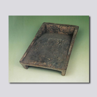 此砚为陶制箕形。砚前端平宽,后端略深为贮水。砚底有一长方形阴文四字款。